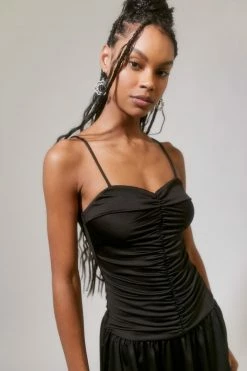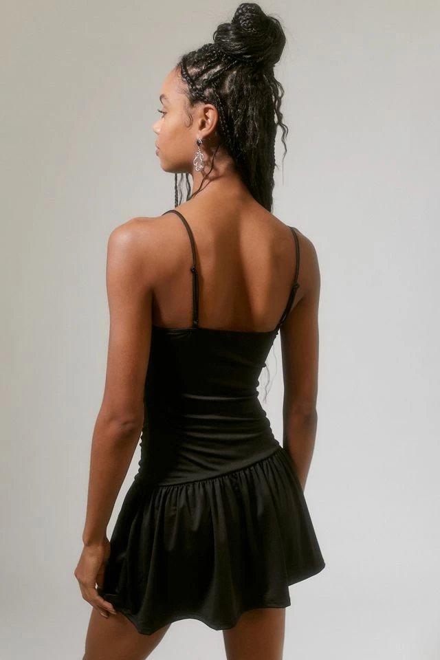 Ruched drop waist dress from the parties collection by Urban Renewal. Fitted with thin shoulder straps and a ruffle edge hem. Created from deadstock or discarded fabrics that would have gone unused, this brand-new dress was made in Los Angeles by Urban Renewal.