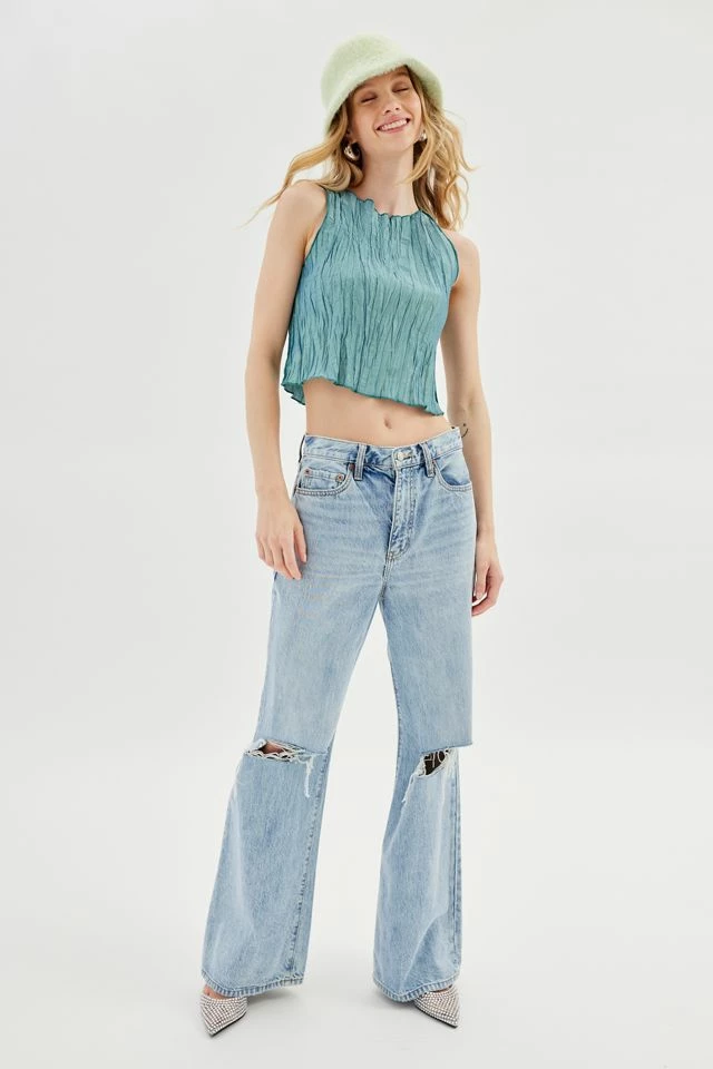 Sleeveless plisse top by Urban Renewal. Fitted with a zip closure at the back. Cut in a cropped length. Created from deadstock or discarded fabrics that would have gone unused, this brand-new top was made in the USA by Urban Renewal.