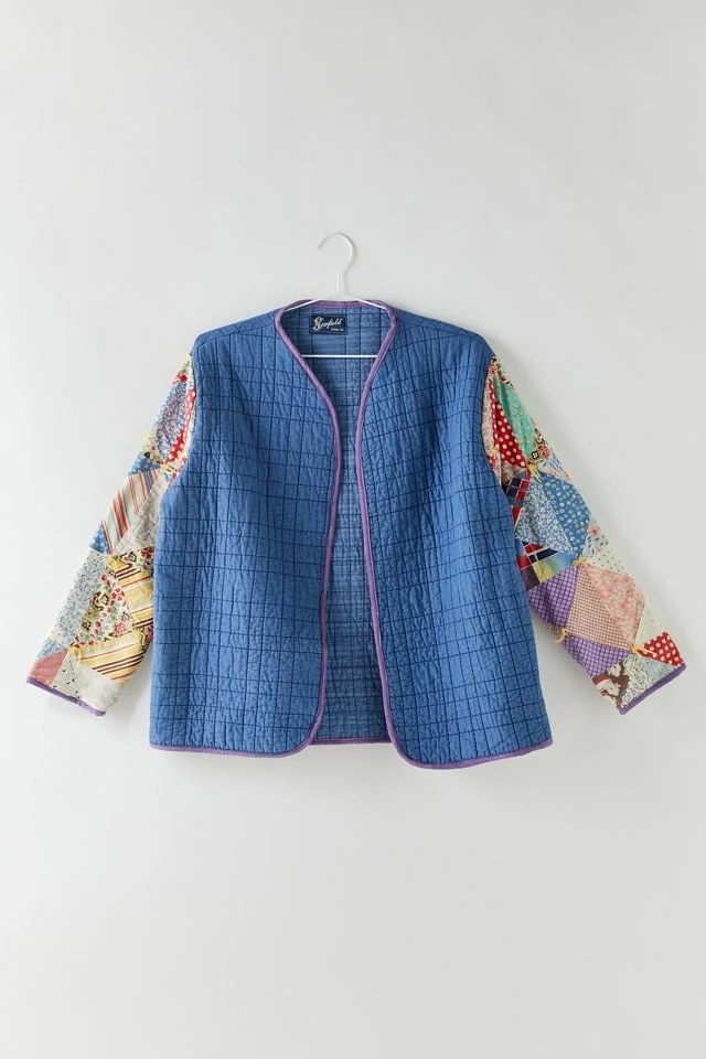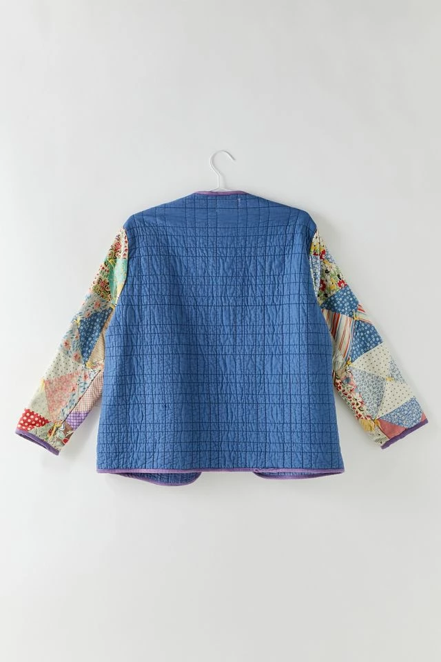 One-of-a-kind quilted jacket crafted for a new take on vintage materials. Open front style finished with contrast trims. We only have one of these unique vintage finds!