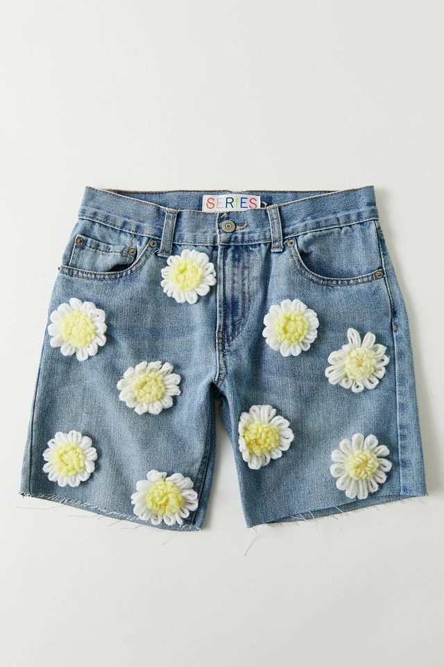 Daisy embellished denim shorts by THE SERIES. Each pair is one-of-a-kind. Crafted exclusively from renewed and reworked pre-existing materials, THE SERIES makes seasonless and genderless pieces that are each completely one-of-a-kind. Because each item is reconstructed by hand using vintage materials, imperfection and variation are to be expected and help add to the magic of your totally unique piece.