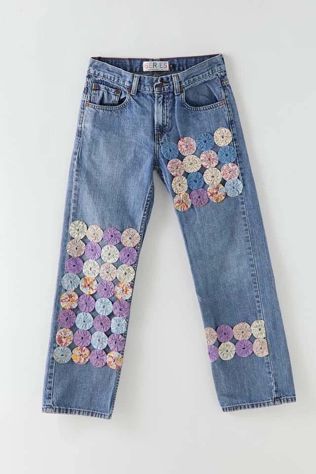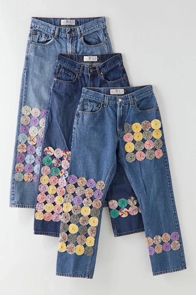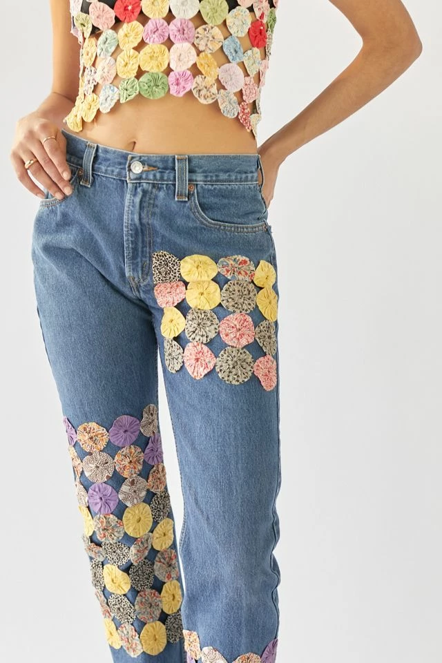 Updated jeans created by THE SERIES. Each pair is one-of-a-kind. Crafted exclusively from renewed and reworked pre-existing materials, THE SERIES makes seasonless and genderless pieces that are each completely one-of-a-kind. Because each item is reconstructed by hand using vintage materials, imperfection and variation are to be expected and help add to the magic of your totally unique piece.