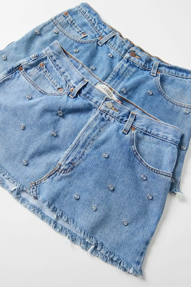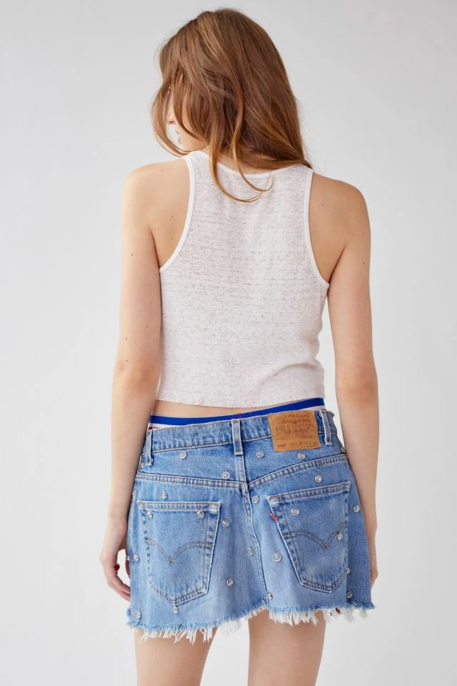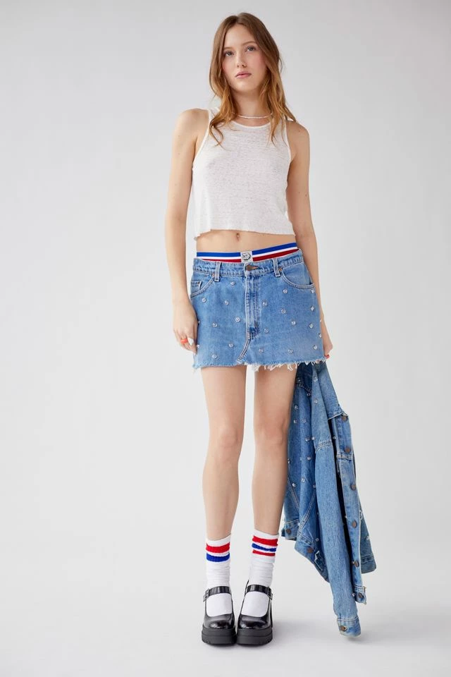 Vintage denim mini skirt from the parties collection by Urban Renewal. Remade in Pennsylvania. Features allover rhinestone detailing. This modern design was created by Urban Renewal from unique vintage and deadstock items found around the world. Though similar in style to what you see here, each upcycled item is one-of-a-kind and may vary from piece to piece.