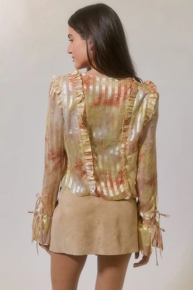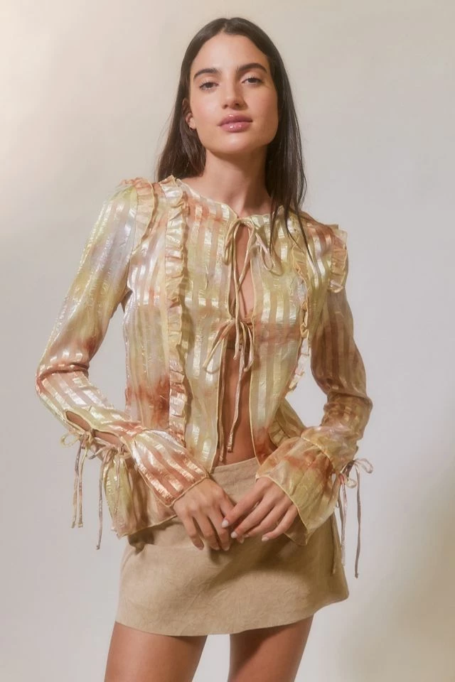 Party-ready tie-front top from the parties collection by Urban Renewal and made in Los Angeles. Iridescent look with tie detailing at the front & cuffs. Created from deadstock or discarded fabrics that would have gone unused, this brand-new top was made in the USA by Urban Renewal.
