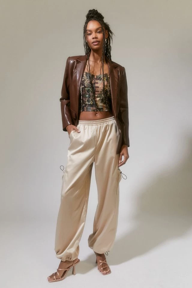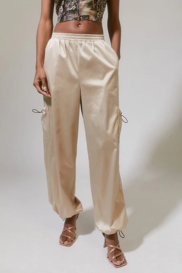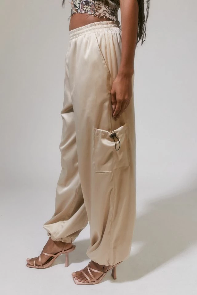 Satin balloon pants form the parties collection by Urban Renewal. Features cargo style pockets and adjustable drawcord accents. Fitted with an elastic waistband for a pull-on style. Created from deadstock or discarded fabrics that would have gone unused, these brand-new pants were made in Los Angeles by Urban Renewal.