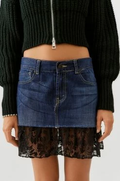 Low-rise mini skirt by Urban Renewal featuring reworked Levi’s. Finished with lace trim made from upcycled vintage tablecloths with an overdyed wash effect. This modern mini skirt was created by Urban Renewal from unique vintage and deadstock items found around the world. Though similar in style to what you see here, each upcycled item is one-of-a-kind and may vary from piece to piece.