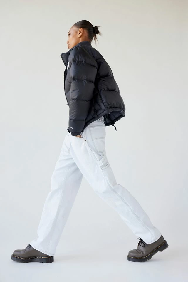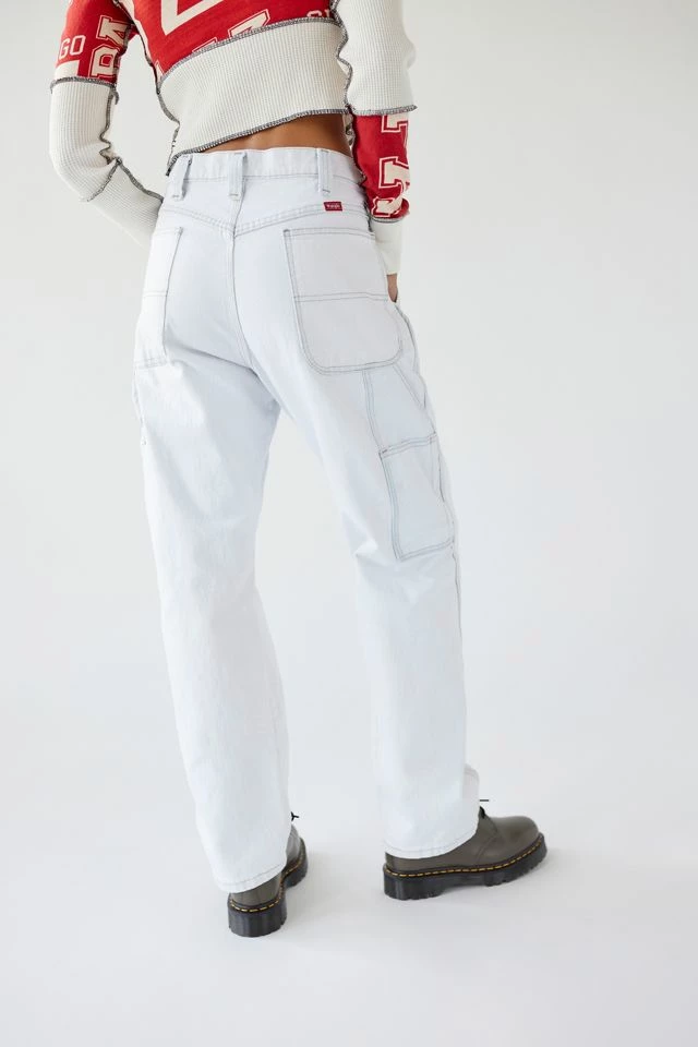 Updated vintage carpenter jeans by Urban Renewal with a crossover button closure at the front. Fitted with utility style pockets. This modern pant style was created by Urban Renewal from unique vintage and deadstock items found around the world. Though similar in style to what you see here, each upcycled item is one-of-a-kind and may vary from piece to piece.