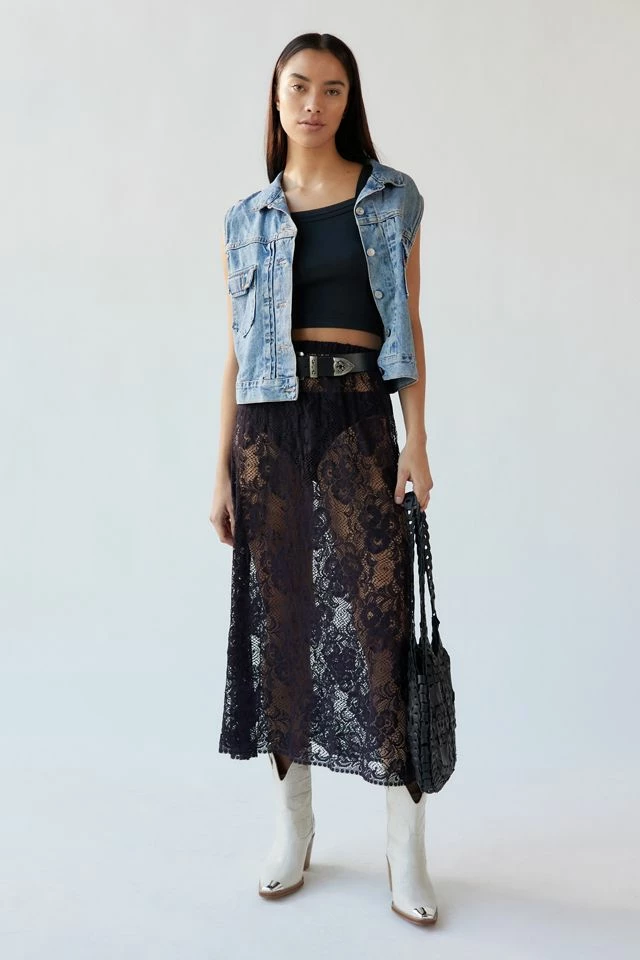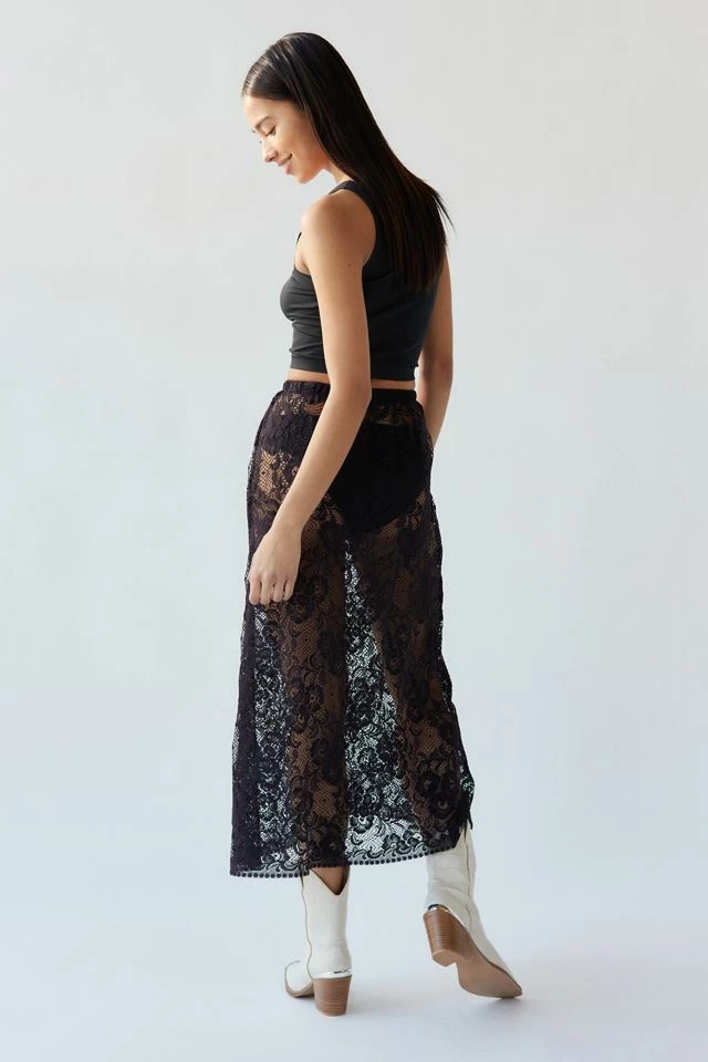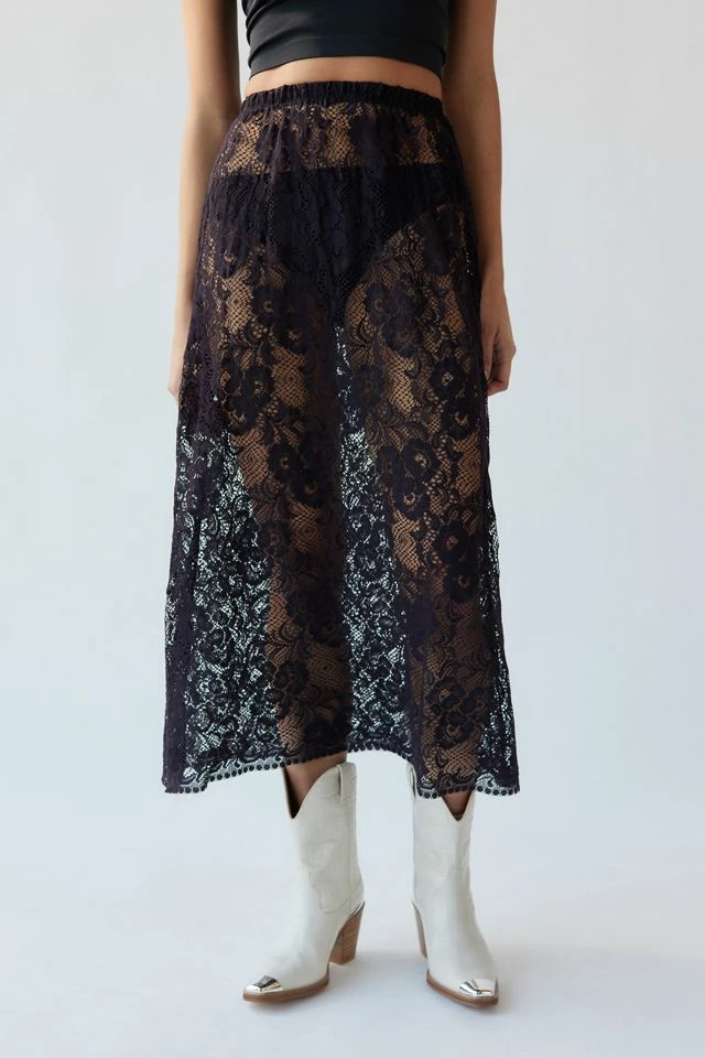 Overdyed lace skirt by Urban Renewal. Midi length skirt in a sheer fabrication & fitted with an elastic waistband. This modern design was created by Urban Renewal from upcycled tablecloths given an overdyed wash effect. Though similar in style to what you see here, each upcycled item is one-of-a-kind and may vary from piece to piece.