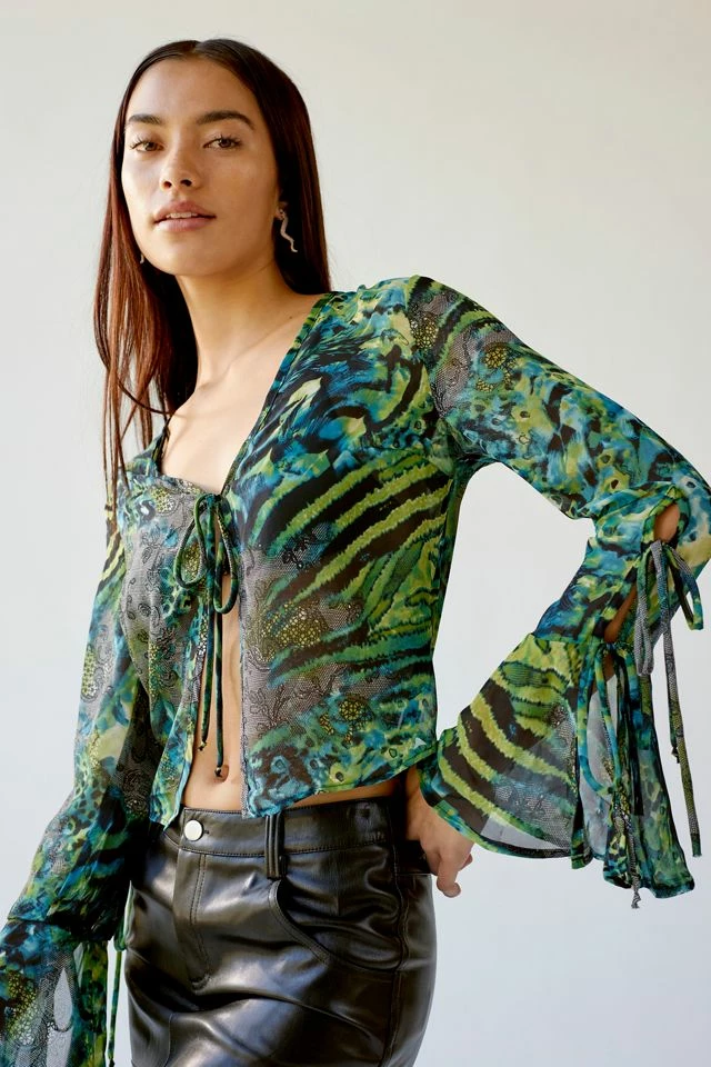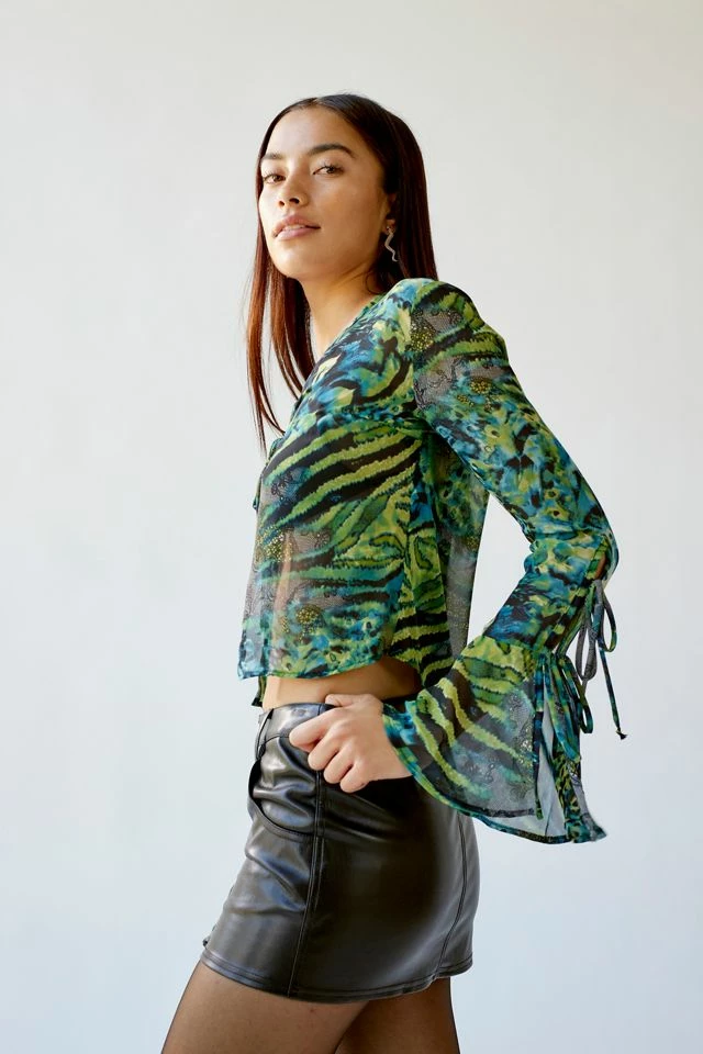Tie-front top by Urban Renewal with an allover animal print. Bell sleeve styles with tie accents. Created from deadstock or discarded fabrics that would have gone unused, this brand-new top was made in the USA by Urban Renewal.