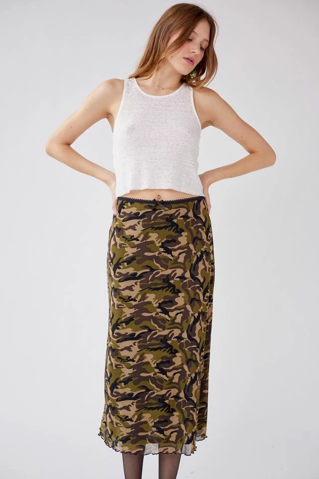 Allover camo pattern skirt by Urban Renewal. Cut in a maxi length with a lettuce edge hem and elastic waist. Created from deadstock or discarded fabrics that would have gone unused, this brand-new skirt was made in the USA by Urban Renewal.