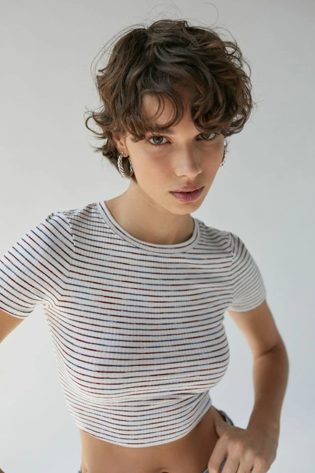 Cropped fit baby tee by Urban Renewal. Features a ribbed knit fabric with an allover stripe pattern. Short sleeve style finished with a crew neck. Created from deadstock or discarded fabrics that would have gone unused, this brand-new top was made in the USA by Urban Renewal.