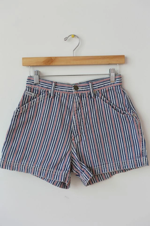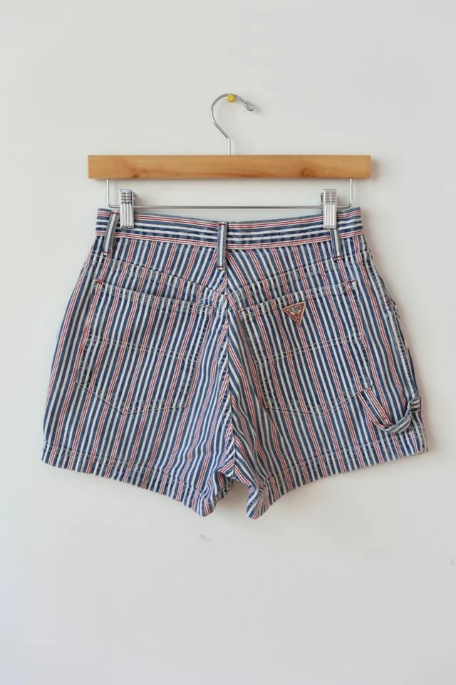 – Vintage Guess Pin Striped High Waisted Cargo Shorts. These gorgeous pin striped shorts have blue, white and red stripes with a classic zipper fly Guess fit. These have more of a cargo look to them and are a perfect addition to any summer outfit. Made from 100% cotton, made in the USA and in great condition 8/10 with some light wear.